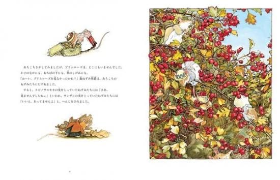 それは、きもちのいい秋の日のことでした。ブラックベリーは熟し、ほかの木の実も、たべごろです。野ばらの村のねずみたちは、とりいれに大いそがし。冬にそなえるため、まいあさ、そとに出かけては、木の実や種や根っこをあつめ、きりかぶぐらにたくわえていました。おかげで、きりかぶぐらは、食べ物でぎゅうぎゅうになり、おいしそうなキイチゴのジャムや、パンのかおりでいっぱいでした。(本文より)