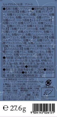 有機エルダーフラワー、有機セージ、有機ヤロウ、有機ブラックベリーの葉、有機ジュニパーベリー、有機タイム、有機プリムローズ、有機カモミール