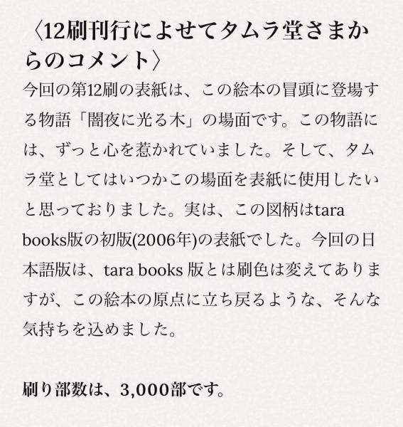 今回の第12刷の表紙は、この絵本の冒頭に登場する物語「闇夜に光る木」の場面です。この物語には、ずっと心を惹かれていました。そして、タムラ堂としてはいつかこの場面を表紙に使用したいと思っておりました。実は、この図柄はtara books版の初版(2006年)の表紙でした。今回の日本語版は、tara books 版とは刷色は変えてありますが、この絵本の原点に立ち戻るような、そんな気持ちを込めました。