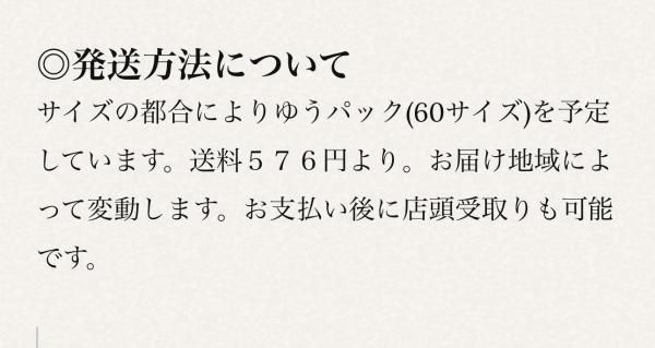 サイズの都合によりゆうパック(60サイズ)を予定しています。送料576円より。お届け地域によって変動します。お支払い後に店頭受取りも可能です。