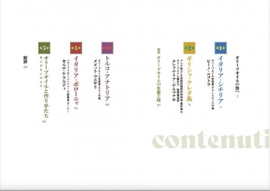 イタリア、ギリシャ、トルコ。世界トップの作り手たちのもとへ現地取材し、彼らが自らの言葉で語る〈自分の人生やオリーブへのこだわり、夢、今後について〉をオールカラーの写真とともに収録しています。