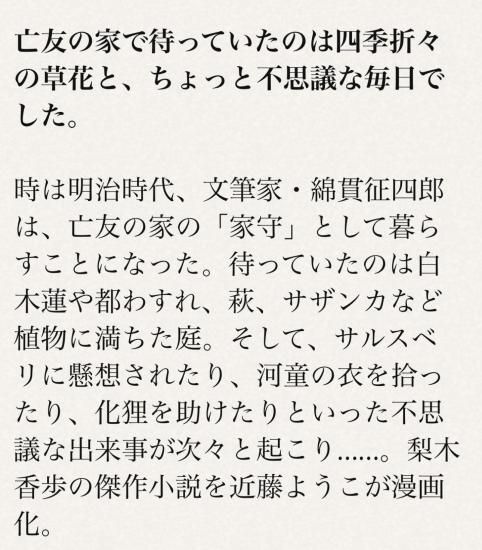 時は明治時代、文筆家・綿貫征四郎は、亡友の家の「家守」として暮らすことになった。待っていたのは白木蓮や都わすれ、萩、サザンカなど植物に満ちた庭。そして、サルスベリに懸想されたり、河童の衣を拾ったり、化狸を助けたりといった不思議な出来事が次々と起こり……。梨木香歩の傑作小説を近藤ようこが漫画化。