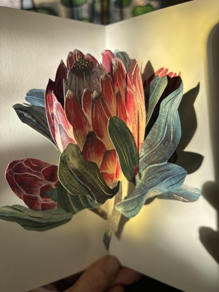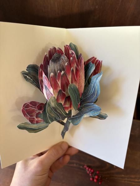 コトリ花店さんのプロテアの生花と草舟あんとす号で人気の武田裕美さんのプロテアのポップアップカードのセットです。クール便でお届けいたします。